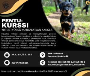 Huhtikuun pentukurssi alkaa 3.4.2023 Kurssi on tarkoitettu koiraharrastajille, joilla on tavoitteena palveluskoirakokeeseen osallistuminen.