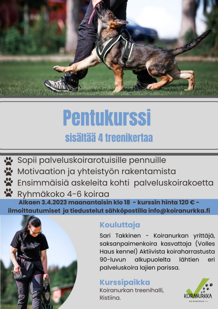 Huhtikuun pentukurssi alkaa 3.4.2023 Kurssi on tarkoitettu koiraharrastajille, joilla on tavoitteena palveluskoirakokeeseen osallistuminen.