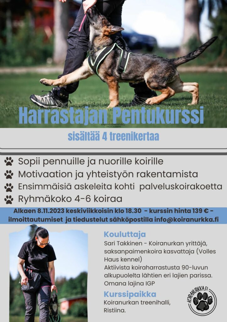 Harrastajan pentukurssi on tarkoitettu palveluskoiralajeihin tähtääville koirakoille. Kurssilla keskitytään erityisesti motivaation ja yhteistyön rakentamiseen jokainen koirakko yksilöllisesti huomioiden. Lisäinfoa voi kysellä sähöpostitse tai soittamalla 0400250333 / Sari
