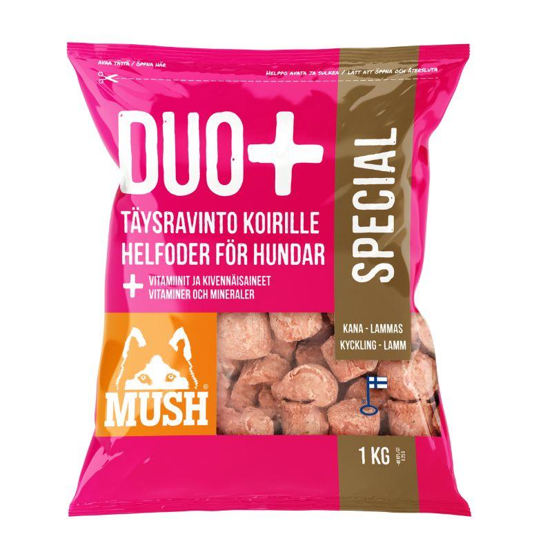 MUSH DUO+ Special (kana–lammas) on laadukas, luonnollisista raaka-aineista valmistettu täysravinto, joka sopii kaikille koiraroduille. Ateria yhdistää miedon kanan ja maistuvan lampaan, tarjoten koiralle tasapainoisen ja ravitsevan kokonaisuuden ilman turhia täyteaineita.