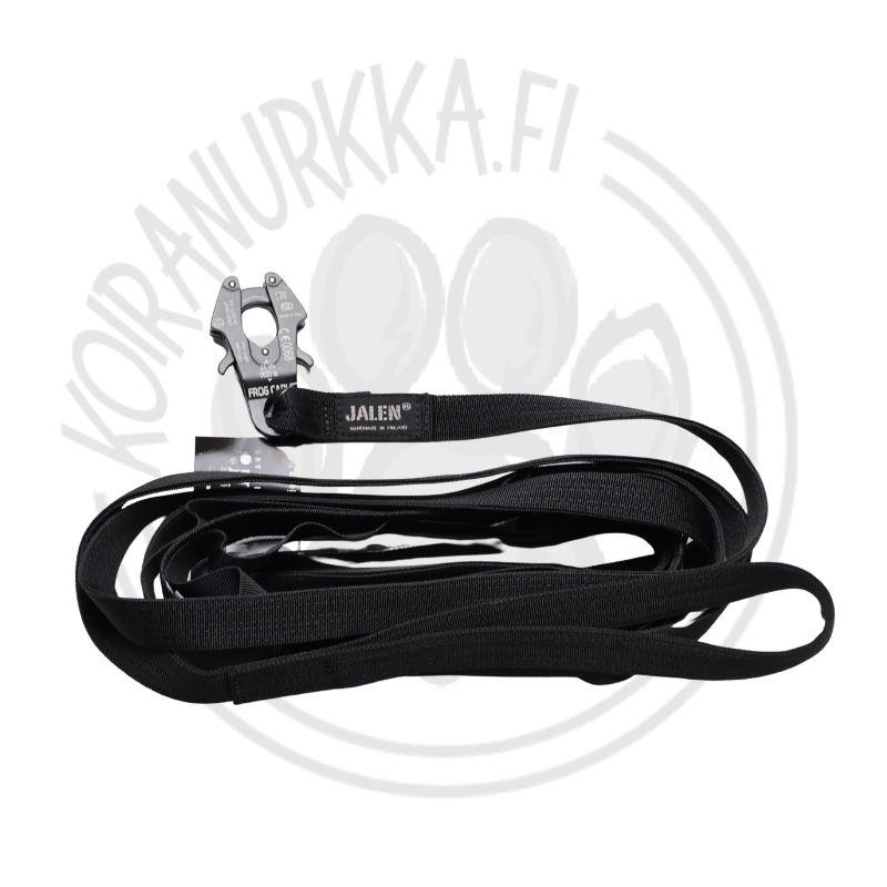 Toisessa päässä on tukeva lenkki turvalliseen kiinnitykseen ja toisessa vahva lukko, joka ei aukea vahingossa kesken treenin. Liina on kehitetty yhteistyössä maalimiehen kanssa, jotta se kestää vaativimmatkin olosuhteet.