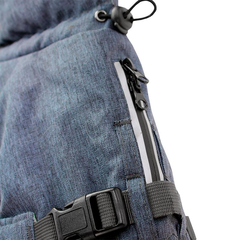 Takin selässä on vesitiivis, vetoketjulla varustettu aukko, jonka kautta talutin voidaan kiinnittää takin alla oleviin valjaisiin. Myös kauluksessa on oma läpivienti taluttimen kiinnittämiseksi pantaan. Korkea kaulus suojaa herkän niskan alueen. Kauluksen sisällä on kuminauhalla kiristettävä trikookaulus lumi- ja tuulisulkuna. Trikookaulus voidaan myös vetää ylös koiran pään ja korvien suojaksi.